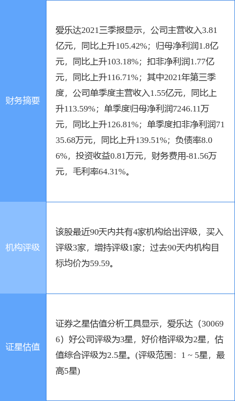 爱乐达披露2021年年度报告,报告期内,公司实现营业收入6.14亿元,同比增长102.12%;归母净利润2.55亿元,同比增长86.47%;基本每股收益1.08元,年报推每10股转增2股并派发现金红利2元(含税)。