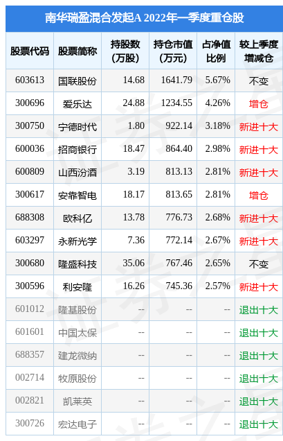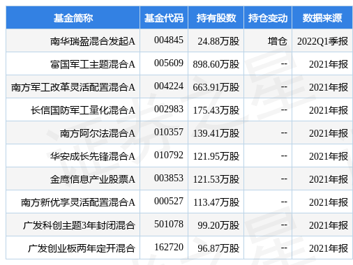 根据2022Q1季报基金重仓股数据,重仓该股的基金共1家,其中持有数量最多的基金为南华瑞盈混合发起A。南华瑞盈混合发起A目前规模为3.28亿元,最新净值1.3128(3月22日),较上一日下跌1.0%,近一年上涨7.35%。该基金现任基金经理为刘斐何林泽。何林泽在任的公募基金包括:南华瑞泰39个月定开A,管理时间为2021年4月28日至今,期间收益率为3.02%;南华瑞泽债券A,管理时间为2021年6月3日至今,期间收益率为-0.05%;南华瑞利债券A,管理时间为2021年9月8日至今,期间收益率为1.13%。刘斐在任的公募基金包括:南华瑞扬纯债A,管理时间为2020年5月27日至今,期间收益率为17.94%;南华瑞恒中短债债券A,管理时间为2021年4月21日至今,期间收益率为-2.5%;南华丰汇混合,管理时间为2022年2月28日至今,期间收益率为4.88%。
