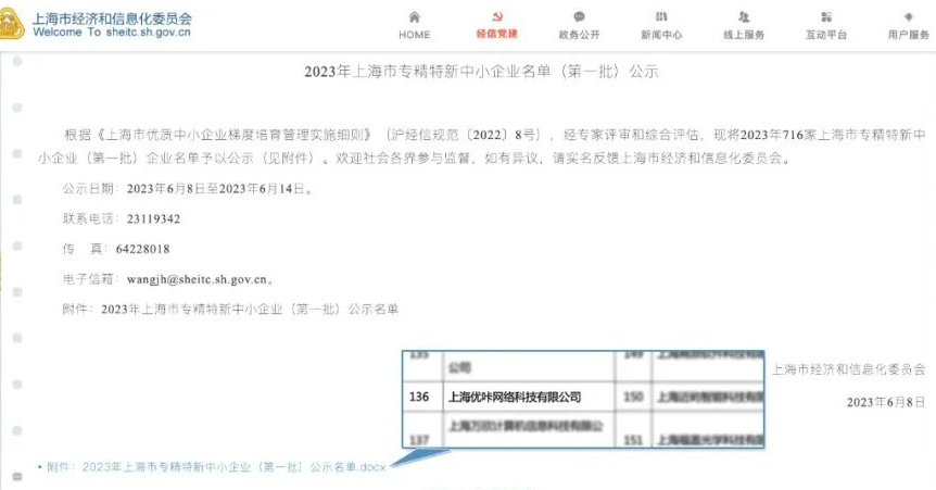 6月,上海市经济和信息化委员会公布2023年第一批上海市专精特新中小企业名单,优咔科技荣膺2023年上海市专精特新中小企业认定。