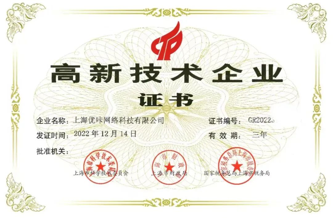 3月,子公司-优咔科技收到由上海市科学技术委员会、上海市财政局、国家税务总局上海市税务局联合颁发的《高新技术企业证书》。