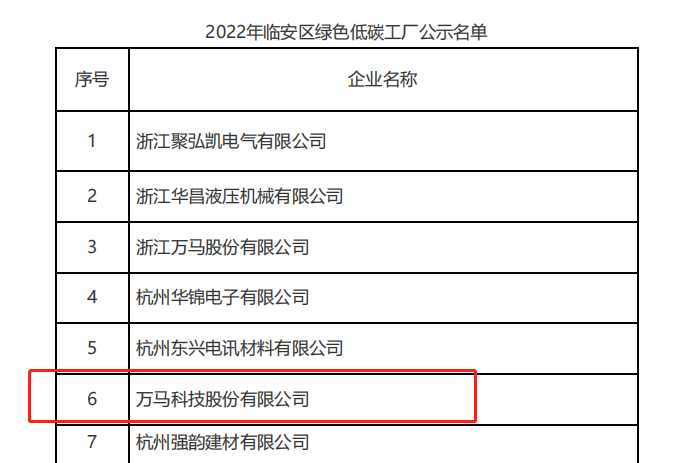 3月,临安区经济和信息化局公布2022年临安区绿色低碳工厂名单,万马科技榜上有名。