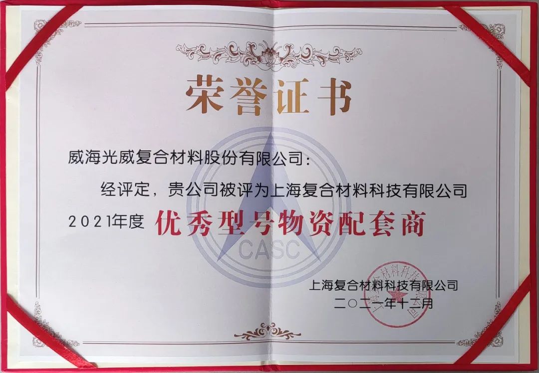 近日,威海光威复合材料股份有限公司荣获上海复合材料科技有限公司2021年度优秀型号物资配套商奖项。