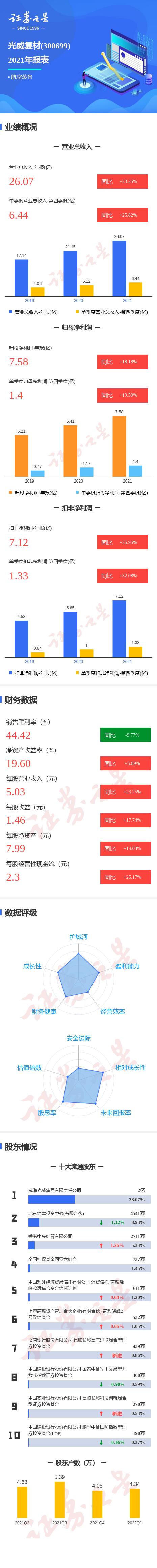 光威复材2021年报显示,公司主营收入26.07亿元,同比上升23.25%;归母净利润7.58亿元,同比上升18.18%;扣非净利润7.13亿元,同比上升25.95%;其中2021年第四季度,公司单季度主营收入6.45亿元,同比上升25.82%;单季度归母净利润1.4亿元,同比上升19.5%;单季度扣非净利润1.33亿元,同比上升32.08%;负债率23.28%,投资收益159.88万元,财务费用952.55万元,毛利率44.42%。