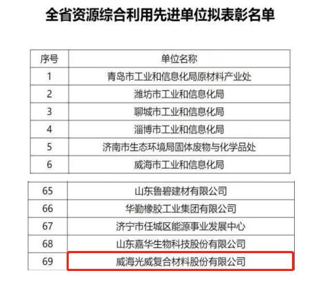 近日,山东省工业和信息化厅公示了全省资源综合利用先进单位名单位,我区威海光威复合材料股份有限公司成功入选。