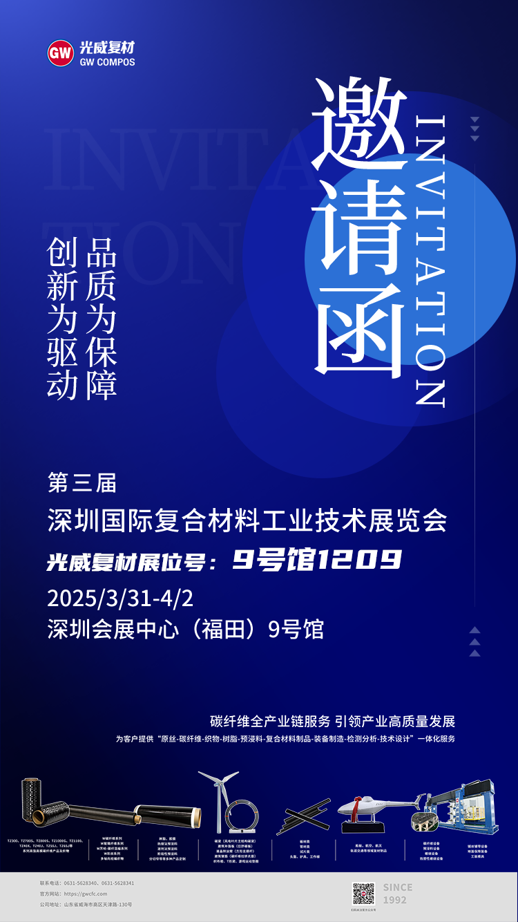 我们诚邀您莅临将于2025年3月31日-4月2日举办的第三届深圳国际复合材料工业技术展览会,光威复材在9号馆1209展位恭候您的到来!作为中国碳纤维及复合材料领域的领军企业,我们期待与您共探复合材料技术革新与产业升级的新机遇。