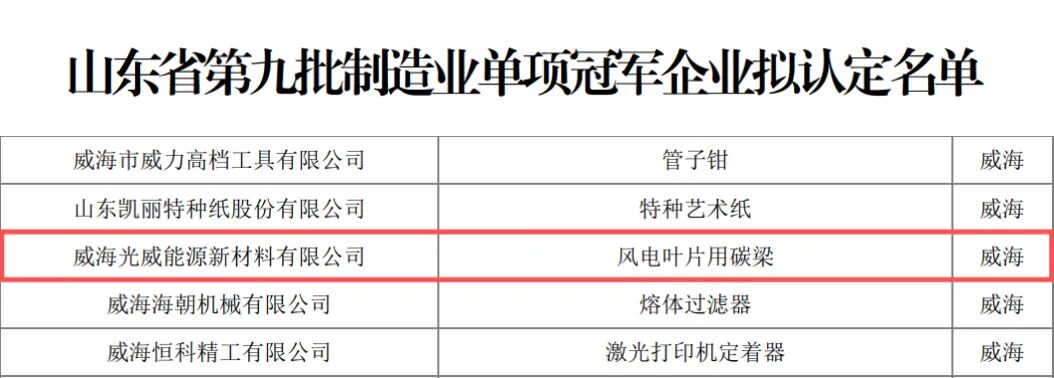 12月2日,由 山东省工业和信息化厅 发布的第九批制造业单项冠军拟认定名单及第三、六批复核拟通过名单结束公示, 光威复材 斩获双佳绩! 威海光威能源新材料有限公司 凭借“风电叶片用碳梁”成功入选第九批制造业单项冠军,威海光威复合材料股份有限公司“预浸料”通过第三批复核,彰显硬核产业实力。