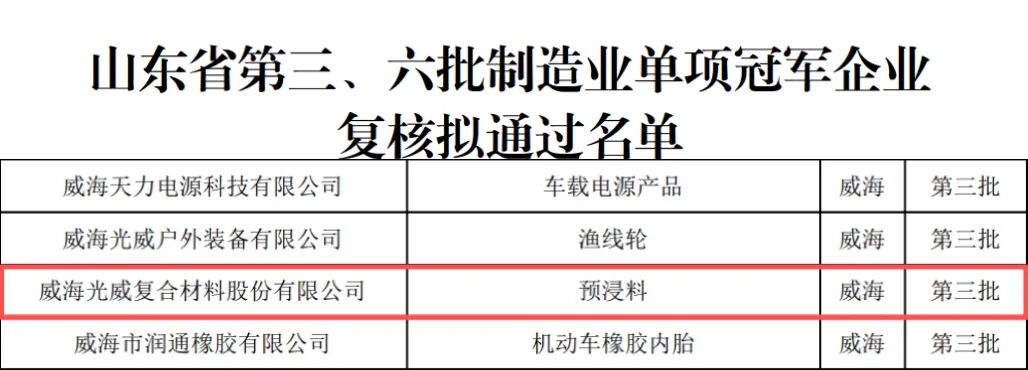 光威复材 “预浸料”通过第三批单项冠军复核
