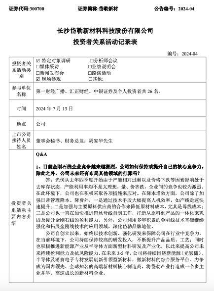 长沙岱勒新材料科技股份有限公司(以下简称“岱勒新材”或“公司”)7月14日发布公告称,公司于7月13日接受了多家机构投资者的特定对象调研和现场参观。在活动中,岱勒新材透露,目前光伏行业整理处于去库存状态,各个环节开工率整体不足,公司产品金刚石线产能利用率也不高,其次产品价格在二季度持续下降,导致二季度公司业绩继续承压。公司对上半年的经营情况进行了认真的总结,结合当前产业的发展现状并制定了相应的应对措施,内部强化措施实现降本增效,外部强化市场开拓提升市占率,同时积极推进其他产业产品的批量化应用。