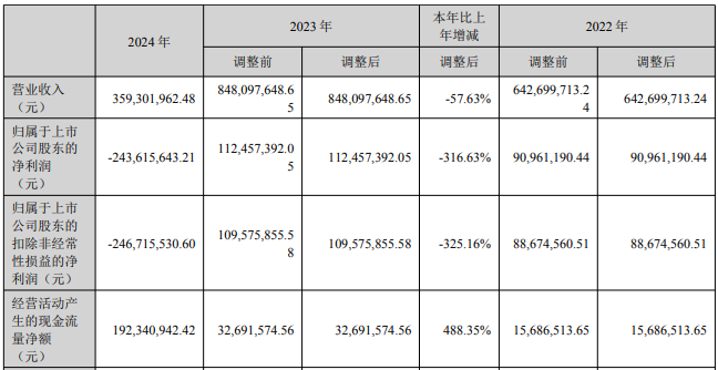 2024年,岱勒新材实现营业收入3.59亿元,同比下降57.63%;归属于上市公司股东的净利润-2.44亿元,上年同期为1.12亿元;归属于上市公司股东的扣除非经常性损益的净利润-2.47亿元,上年同期为1.10亿元;经营活动产生的现金流量净额为1.92亿元,同比增长488.35%。