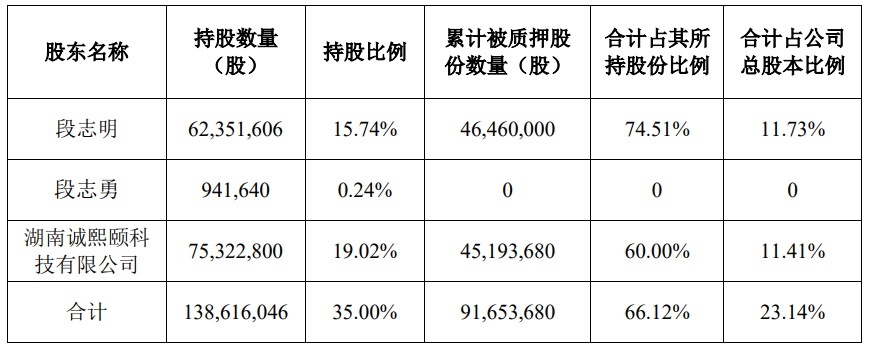 公告显示,段志明累计被质押股份46,460,000股,占其所持股份比例74.51%,占公司总股本11.73%;诚熙颐累计被质押股份45,193,680股,占其所持股份比例60.00%,占公司总股本11.41%。