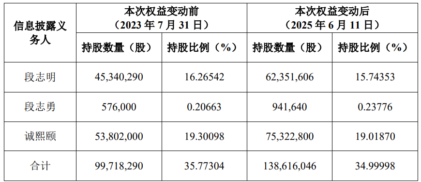 公司实际控制人、董事长段志明及其一致行动人段志勇、湖南诚熙颐科技有限公司(简称“诚熙颐”)于2023年7月31日至2025年6月11日期间,因其一致行动人段志勇2024年度增持导致占公司总持股比例增加0.03%、因公司2023年年度权益分派实施导致占公司总持股比例合计被动增加0.12%、因2021年限制性股票激励计划预留授予第一个归属期归属及首次授予第二个归属期归属上市导致占公司总持股比例合计被动稀释0.64%、因段志明在2025年6月11日通过集中竞价交易方式合计减持公司无限售条件流通股1,124,800股,导致占公司总持股比例减少0.28%。截至公告披露日,段志明及其一致行动人合计持有138,616,046股,占公司总股本比例34.99998%。