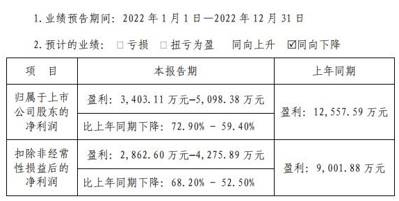 1月31日,森霸传感发布业绩预告,预计2022年归属于上市公司股东的净利润3403.11万元~5098.38万元,同比下降59.4%~72.9%。
