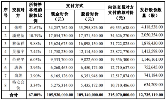 本次交易上市公司拟以发行股份及支付现金方式购买朱唯、潘建新、林荣祥、吴薇宁、范建平、唐蓉、俞彪及格安合伙持有的标的公司67%股权。交易双方以立信评估出具的资产评估报告的评估值为依据,协商确定标的公司67%股权交易价格为21,507.00万元。本次交易对价以发行股份及支付现金的方式支付,其中现金支付对价10,593.00万元,股份支付对价10,914.00万元。
