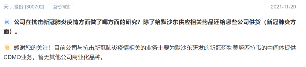 令人疑惑的是,在获得与这款备受期待的新冠口服药相关订单后,天宇股份却没有选择公告方式进行披露,而是在互动易上进行了透露。