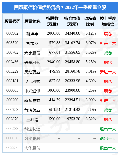 国泰聚信价值优势混合A的前十大重仓股如下: