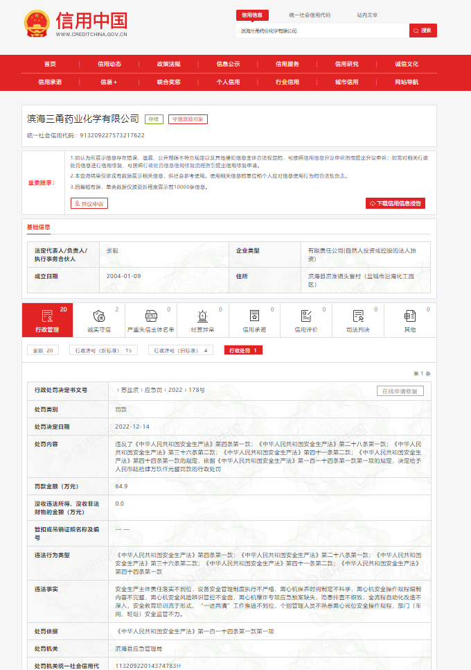 ﹝苏盐滨﹞应急罚﹝2022﹞178号罚单显示,由于存在“安全生产主体责任落实不到位,设备安全管理制度执行不严格,离心机保养时间制定不科学,离心机安全操作规程编制内容不完整,离心机安全风险辨识管控不全面,离心机爆炸专项应急预案缺失,隐患排查不细致,全流程自动化改造不深入,安全教育培训流于形式,“一述两清”工作推进不到位,个别管理人员不熟悉离心岗位安全操作规程,部门(车间、班组)安全监管不力。”根据《中华人民共和国安全生产法》第一百一十四条第一款第一项的有关规定,滨海县应急管理局对滨海三甬作出罚款64.9万元的处罚决定。