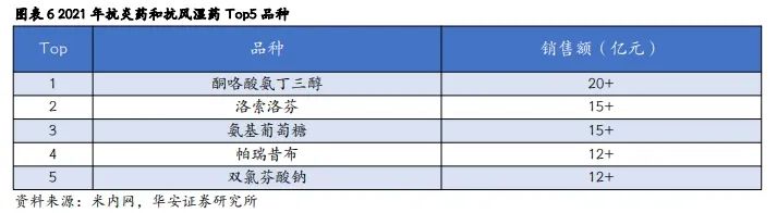 洛索洛芬钠作为一种非甾体抗炎药是治疗慢性疼痛的主流药物。美国风湿病学会发布的指南《手、髋部和膝关节骨关节炎的非药物和药物治疗建议》中建议非甾体抗炎药用于治疗轻度到中度的关节疼痛,通过缓解疼痛来改善病情。2021 年在中国城市公立医院、县级公立医院、城市社区中心及乡镇卫生院(简称中国公立医疗机构)终端抗炎药和抗风湿药销售 Top5 的品种中酮咯酸氨丁三醇,洛索洛芬和双氯芬酸钠均属于非甾体抗炎药。其中酮咯酸氨丁三醇和洛索洛芬分别以超过 20 亿元和超过 15 亿元的销售额位居前两位,其中九典制药的洛索洛芬钠凝胶贴膏占据了半壁江山。