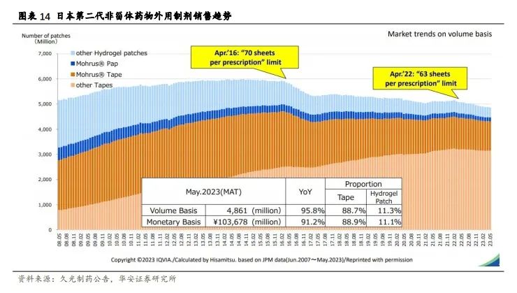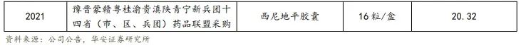 国内首仿产品,“国谈+多次集采”,先入市场优势明显,价格利空尽出。2023年 H1 洛索洛芬钠凝胶贴膏收入 6.99 亿元,同比增长 21.35%,占公司总收入的 57%,药品制剂板块占公司总收入的 83%。2022 年 3 月被纳入集采,单贴价格由 2021 年约 20.7 元/贴降至 18.1 元/贴。2023 年浙江省和京津冀“3+N”联盟将洛索洛芬钠凝胶贴膏纳入集中采购名单。未来预计多次集采后,洛索洛芬钠凝胶贴膏的价格将维持稳定。