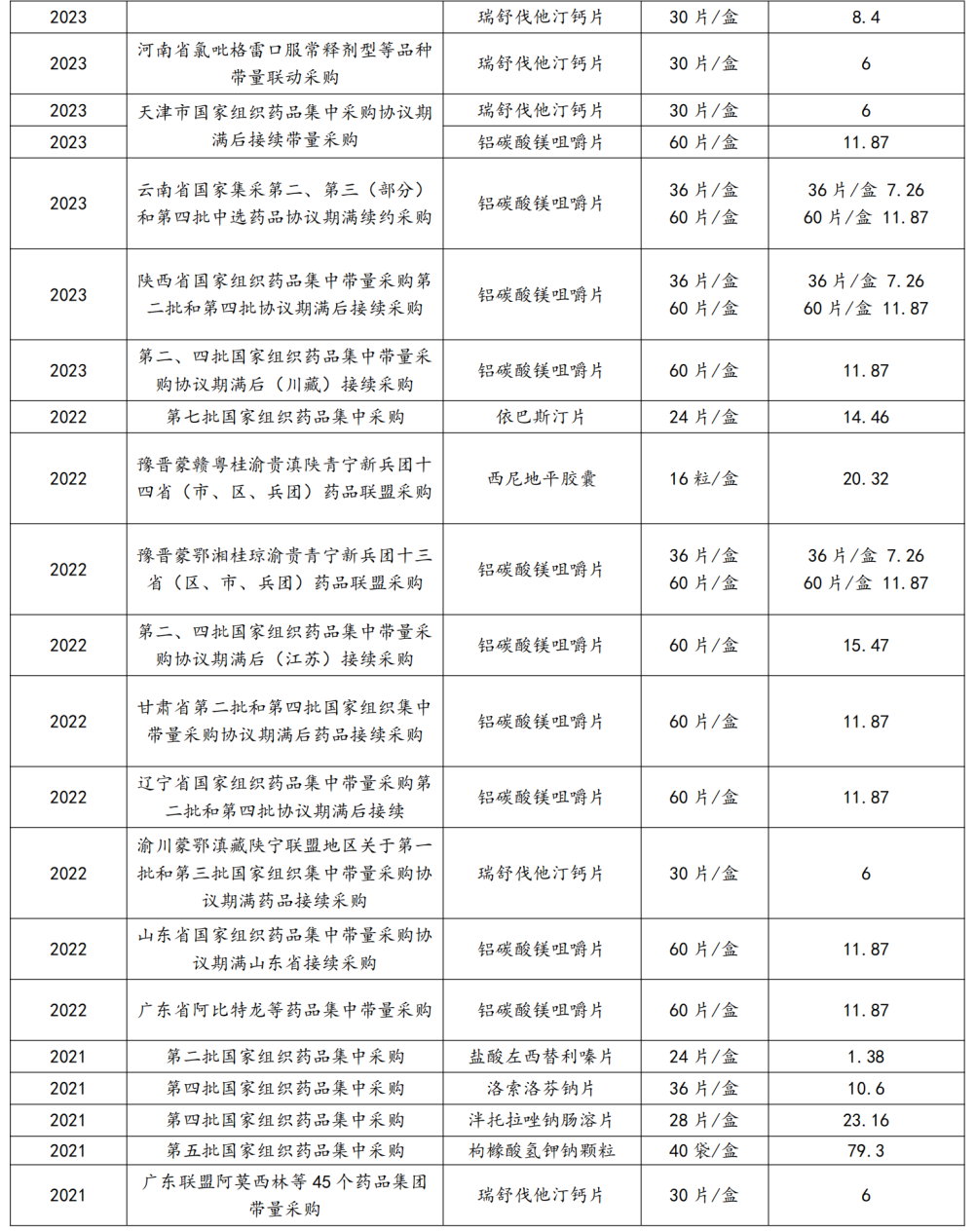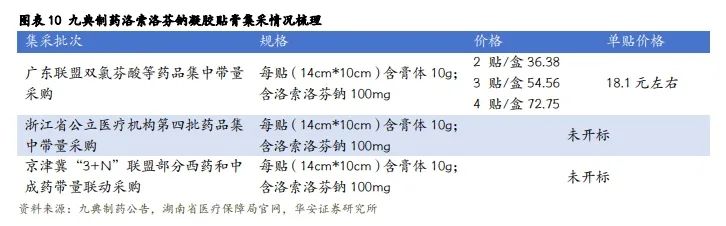 洛索洛芬钠凝胶贴膏多次集采后,价格利空尽出。洛索洛芬钠凝胶贴膏自 2017年上市后,价格较稳定,收入规模的增长主要是由于医院端持续放量。2021 年洛索洛芬钠凝胶贴膏收入 8.49 亿元,销售 4107.4 万贴,平均单价 20.7 元/贴。2022 年3 月九典制药洛索洛芬钠凝胶贴膏被纳入广东联盟双氯芬酸等药品集中带量采购,中标价 18.1 元/贴,降幅较小。截至 2023 年 6 月底,广东联盟地区集采已经在山西省、广东省、青海省、海南省、河南省、新疆维吾尔自治区和新疆生产建设兵团、宁夏回族自治区执行,其中广东省和河南省实现了较好的以价换量。2023 年浙江省公立医疗机构第四批药品集中带量采购将洛索洛芬钠凝胶贴膏纳入 B 组名单;同年,京津冀“3+N”联盟部分西药和中成药带量联动采购洛索洛芬钠凝胶贴膏纳入采购品种名单(第一批)中。未来预计多次集采后,洛索洛芬钠凝胶贴膏的价格将维持稳定,以价换量带来的销售增长将维持该产品规模稳步上升。