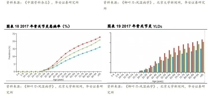 随着人口老龄化增长,我国骨关节炎患病率不断攀升。骨关节炎是骨关节疾病中最常见的疾病,根据中华医学会骨科学分会的统计数据显示,骨关节炎,骨关节疾病中占比超过 70%。2015 年《中国骨科杂志》文章“中国 40 岁以上人群原发性骨关节炎患病状况调查”研究了中国 6218 份 40 岁以上人群原发性骨关节炎调查表发现:40~49 岁人群骨关节炎患病率仅有 30.1%,随着年龄增长 60 岁以上人群骨关节炎患病率达到了 62.2%。根据《柳叶刀-风湿病学》杂志 2019 年文章“1990-2017中国骨关节炎疾病负担变化”研究显示:中国骨关节炎患病人数从 1990 年的 26.1百万人上升至 2017 年的 61.2 百万人,超过了人口总量的增加。YLDs(years livedwith disability,伤残损失生命年:是一个指标用于综合显示骨关节炎后遗症对患者残疾程度,数值越高程度越严重。)随年龄增加而上升。骨关节炎患病率随年龄增长而增大,骨关节炎对患者致残的严重程度也随年龄增长而上升。