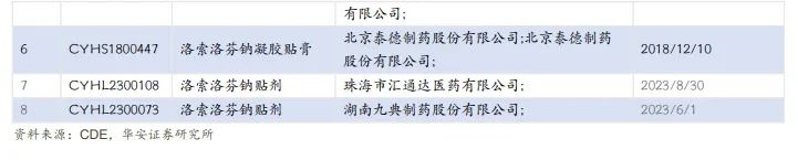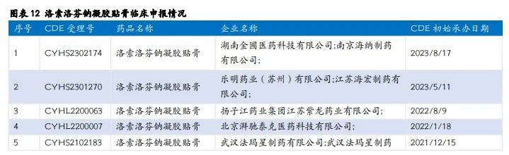竞争格局:洛索洛芬钠凝胶贴膏申报企业多,竞争激烈;九典制药具有“国谈+集采”等先入优势。