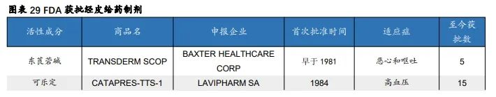 经皮给药制剂可以通过皮肤将药物递送至血管作用于局部或全身,可以被广泛应用至各领域。截至 2023 年 6 月,FDA 审批通过的经皮给药制剂共有 23 个品种,适应症广泛覆盖于心脑血管疾病、生殖系统疾病、神经系统疾病和戒烟等领域,未来开发前景良好。
