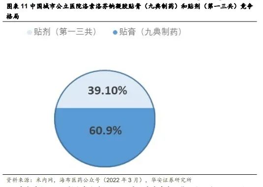 在中国地区凝胶贴膏具有先入优势,销售略胜一筹。洛索洛芬钠在中国目前获批了两种外用制剂,分别是第一三共的洛索洛芬钠贴剂和九典制药的洛索洛芬钠凝胶贴膏。根据中国城市公立医院洛索洛芬钠凝胶贴膏和贴剂的市场占有率显示,九典制药的凝胶贴膏占有 60.9%的市场份额,高于第一三共的贴剂(39.1%)。