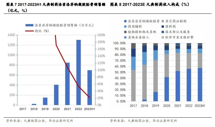 贴膏剂收入规模高速增长,逐步成为公司收入主力贡献者。九典制药洛索洛芬钠凝胶贴膏自 2017 年上市至 2023 年 H1 收入规模持续增长,2017 年-2019 年该产品持续推广,2019 年收入达到了 1.51 亿元,同比增长 524.73%,收入破亿;2019年开始,洛索洛芬钠凝胶贴膏持续放量,2022 年收入规模达到了 13.03 亿元,同比增长 53.54%;洛索洛芬钠凝胶贴膏占总收入的比例,从 2019 年的 16%提升到了2022 年的 56%;2023 年 H1 洛索洛芬钠凝胶贴膏收入 6.99 亿元,同比增长 21.35%,占公司总收入的 57%,药品制剂板块占公司总收入的 83%,洛索洛芬钠凝胶贴膏上市五年后,逐步成熟,收入占比高。