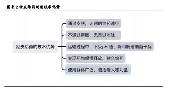 经皮给药制剂技术优势明显。经皮给药(transdermal drug delivery system;TDDs)是一种通过皮肤无创的将药物运送到体内的途径。与传统的直接给药途径不同,TDDs 不需要使用针头注射。TDDs 不涉及通过胃肠道,小分子药物通常可利用细胞内途径来穿过表皮角质层,因此不会出现首过代谢而导致药物损失;并且药物可以在不受 pH 值、酶和肠道细菌干扰的情况下输送。此外,TDDS 可以控制药物缓慢释放,从而实现持久给药。TDDS 是一种无创给药方法,且对患者的痛苦和负担极小,因此适用群体广包括老人和儿童,技术潜力大