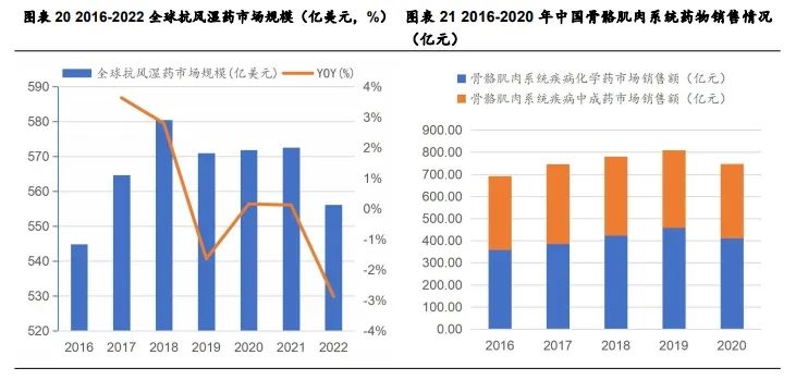 骨骼肌肉系统药物市场规模稳定,未来预计持续增长。2016-2022 年全球抗风湿药市场规模较为稳定,总体略有提升,市场规模维持在 560 亿美元左右,根据 Factsand Factors 预测全球抗风湿药市场规模 2030 年将增长至 701 亿美元左右;2016-2019 年我国骨骼肌肉系统疾病用药市场销售额持续增长,从 691.73 亿元增长至 810.01 亿元,2020 年稍有下降,降至 747.28 亿元,销售情况下降可能是由于2020 年疫情影响医院销售所致。未来预计随着我国人口老龄化不断加剧,骨骼肌肉系统疾病用药市场规模将持续增长。分品种来看,在我国骨骼肌肉系统疾病用药市场中,化学药市场与中成药市场处于较平衡状态,从骨骼肌肉系统疾病中西药的市场销售额来看,化学药的市场销售额高于中成药。2020 年化学药的市场销售额为410.87 亿元,中成药的市场销售额为 336.41 亿元。