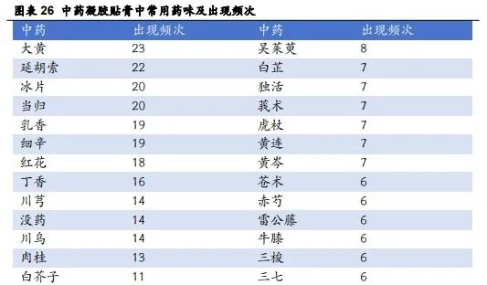 中药凝胶贴膏可选用中药品种多,未来新品开发空间广泛。《中药凝胶贴膏剂中的常用药物及临床应用研究进展》一文中统计发现现目前共有 181 种中药被用于中药凝胶贴膏的研制,其中包括冰片、乳香挥发油、丁香挥发油等成分具有良好的促透作用中药,其在发挥本身药理作用的同时可以促进处方中其他药效成分透过皮肤;此外,与口服制剂相比,中药凝胶贴膏具有可以局部给药、降低药峰浓度、可随时停药的特点,更具备使用有毒中药的可能。