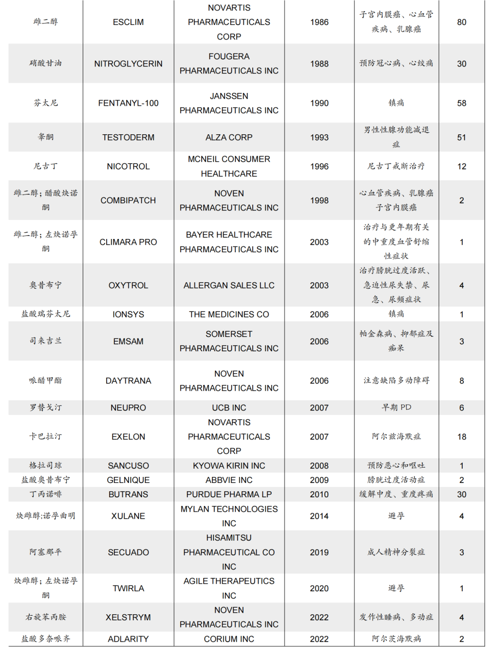 美国经皮给药制剂市场品种丰富,适应症覆盖面广。截至2023 年 6 月,FDA审批通过的经皮给药制剂共有 23 个品种,适应症广泛覆盖于心脑血管疾病、生殖系统疾病、神经系统疾病和戒烟等领域。从产品获批数目来看,用于镇痛的芬太尼和丁丙诺啡、癌症治疗的雌二醇、男性性腺功能减退症治疗的睾酮和阿尔兹海默症治疗的卡巴拉汀受关注较广泛。