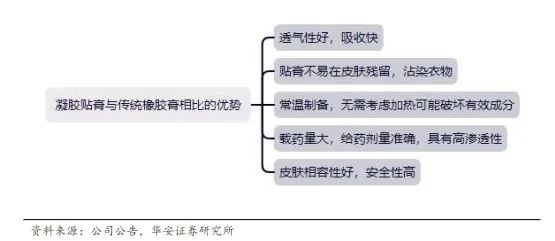 凝胶贴膏与传统贴膏相比具有技术优势。凝胶贴膏具有透气性良好、强力渗透、透皮吸收快速、可反复使用并无膏体在皮肤残留、不易沾染衣物明显优势。凝胶贴膏采用常温工艺,而传统中药橡胶膏使用高温工艺制备,可能会导致植物功效成分破坏。此外,凝胶贴膏包容药量大(可达到传统橡胶膏的 10-20 倍),给药剂量准确,具有高渗透性,能保证优异的起效速度和起效强度,贴敷舒适、皮肤相容性好,安全性高。