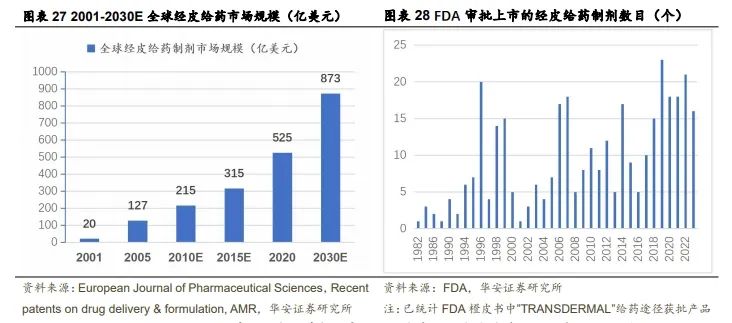 经皮给药制剂市场规模逐步扩大,关注度提升。2001-2020 年全球经皮给药市场规模从 20 亿美元增长至 525 亿美元,FDA 审核通过的经皮给药制剂数目从每年获批 5 个左右增长至每年获批 15 个左右,2022 年共有 21 个经皮给药制剂获批。根据美国联合市场研究公司(AMR)预测自 2021 开始全球经皮给药市场规模将以复合年增长率 4.9%的速度上涨,2030 年达到 873 亿美元。