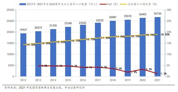 我国人口老龄化不断加剧,老年健康相关政策持续推出,加快老年医学科建立。2012-2021 年,我国 60 周岁及以上老年人口数量逐年提升。2012 年,全国 60 周岁及以上老年人口19437万人,占总人口的14.3%;全国65周岁及以上老年人口12777万人,占总人口的 9.4%;增长至 2021 年,全国 60 周岁及以上老年人口 26736 万人,占总人口的 18.9%;全国 65 周岁及以上老年人口 20056 万人,占总人口的 14.2%。2021 年 12 月 30 日,国务院印发《“十四五”国家老龄事业发展和养老服务体系规划》进一步推进我国老龄事业发展。截至 2021 年末,在全国城乡社区获得健康管理服务的 65 周岁及以上老年人达到 1.19 亿人。全国共有国家老年医学中心 1 个,国家老年疾病临床医学研究中心 6 个,设有老年医学科的二级及以上综合性医院 4685个,建成老年友善医疗机构的综合性医院 5290 个、基层医疗卫生机构 15431 个,设有安宁疗护科的医疗卫生机构 1027 个,设有老年人“绿色通道”的二级及以上综合性医院超 9000 个。