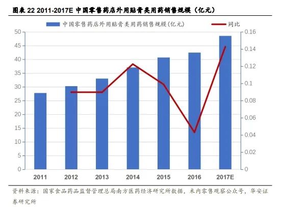 中国贴膏剂市场规模增长快,发展稳定。根据国家食品药品监督管理总局南方医药经济研究所数据显示,我国零售药店外用贴膏类用药销售规模持续增长,2011年为 27.82 亿元,2016 年增长至 42.52 亿元,同比增长 4.32%;预计 2017 年可达48.59 亿元规模,同比增长 14.28%。根据米内网的数据显示,外用贴膏剂 2020 年的市场销售规模约 150 亿,2021 年约 180 亿,整体增长率在 20%左右。