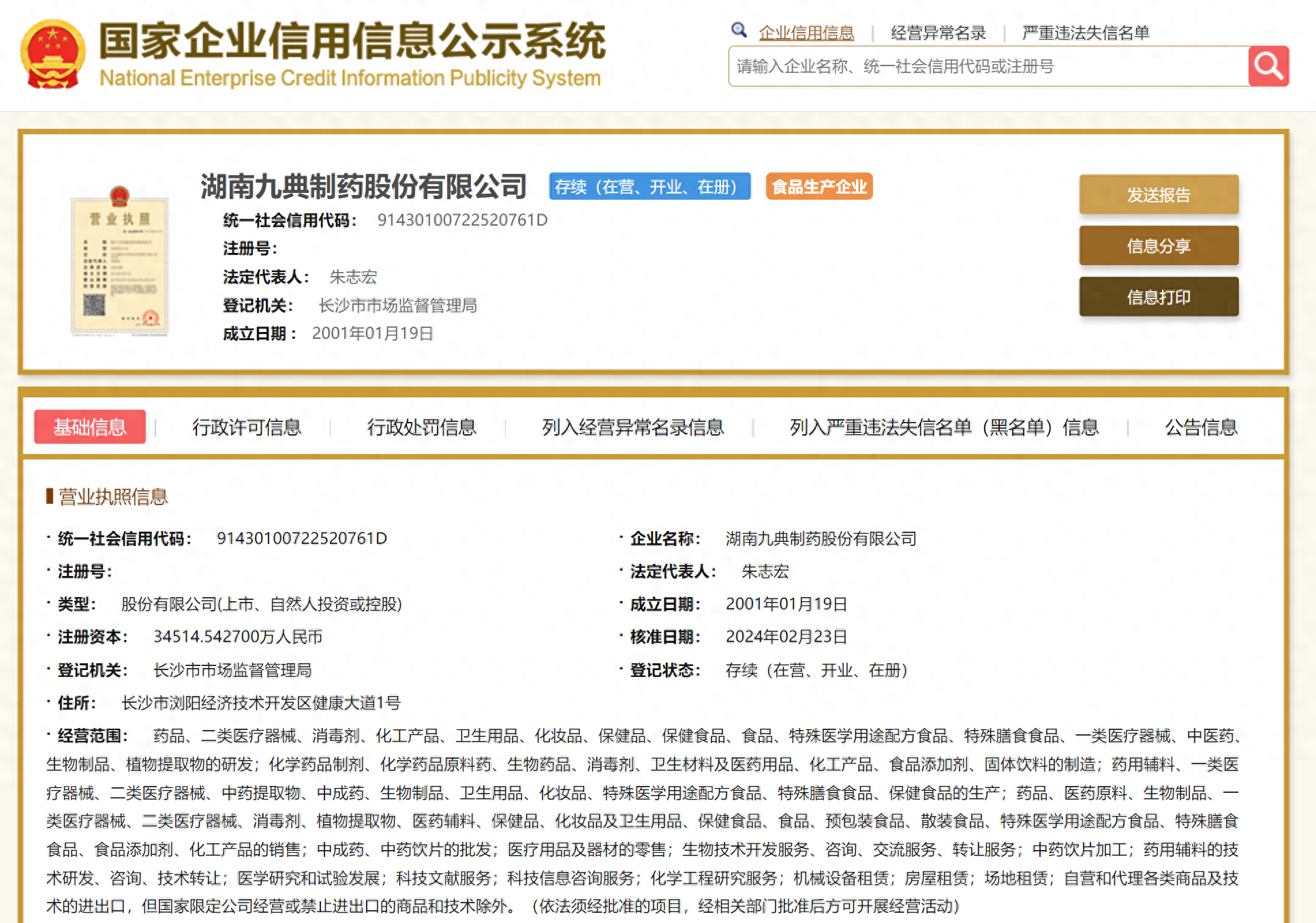 据查,九典制药成立于2001年1月19日,法定代表人为朱志宏,注册资本为3.45亿元,经营范围为药品、二类医疗器械、消毒剂、化工产品、卫生用品、化妆品、保健品、保健食品等。该公司大股东为朱志宏,持股34.04%。目前该公司有12家对外投资企业,包括湖南九典宏阳制药有限公司等。