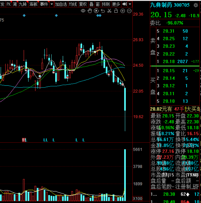 今日,九典制药盘中逼近跌停,跌幅一度接近19%,成交量创出历史新高。