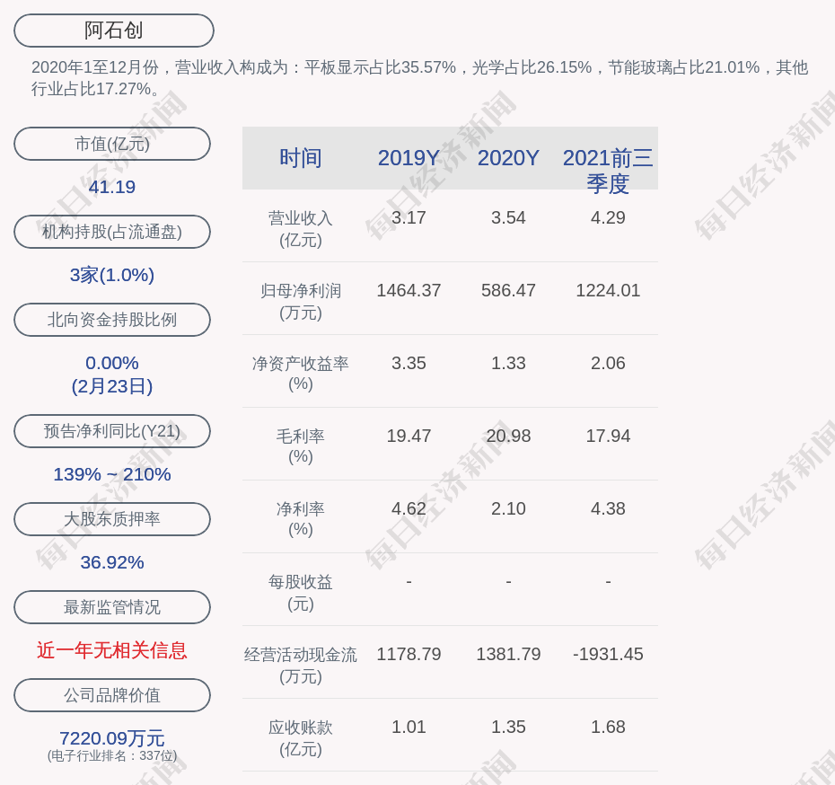 2020年1至12月份,阿石创的营业收入构成为:平板显示占比35.57%,光学占比26.15%,节能玻璃占比21.01%,其他行业占比17.27%。