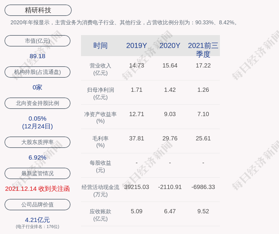 2020年年报显示,精研科技的主营业务为消费电子行业、其他行业,占营收比例分别为:90.33%、8.42%。