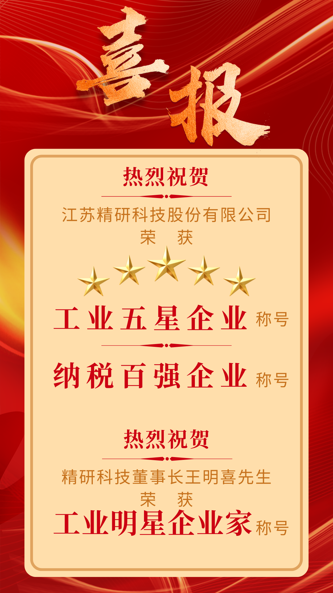 江苏精研科技股份有限公司荣获“工业五星企业”和“纳税百强企业”称号,董事长王明喜先生荣获“工业明星企业家”称号。