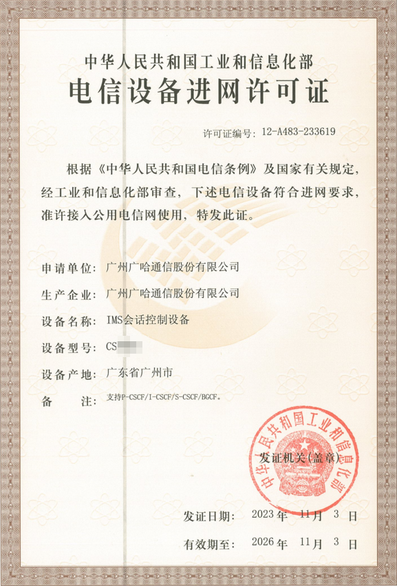 继广哈通信“灵琛”5G核心网获得全系列网元进网许可证及信创适配证后,近日,公司自主研发的IMS会话控制设备成功获得中华人民共和国工业和信息化部(简称“工信部”)颁发的电信设备进网许可证书,标志广哈通信成为国内为数不多的同时获得5G核心网、IMS、软交换及程控交换设备入网许可的厂商。
