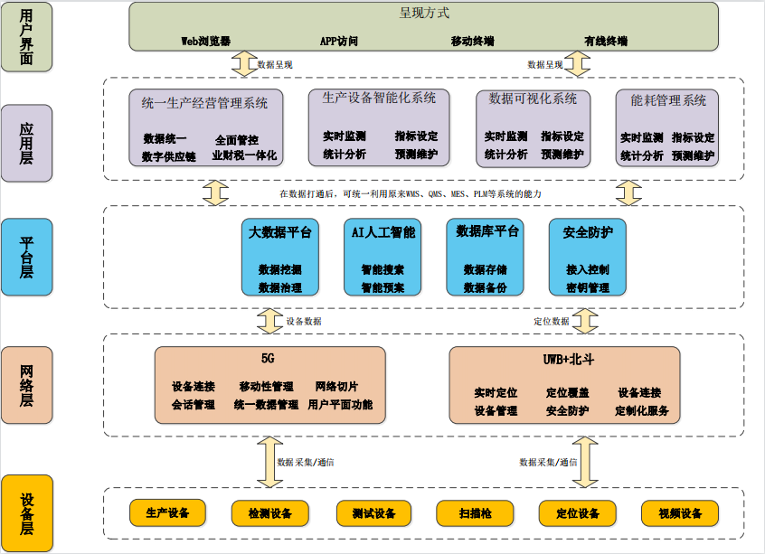 面向能源行业的工业互联网综合安全管控平台的建设是为了满足企业在数字化转型过程中面临的生产过程监控、数据分析和应用、信息安全等复杂需求,通过融合5G、北斗定位、UWB定位等技术,实现对企业人员的高精度定位管理,并在高精度定位基础上,结合上层的信息化管理应用,从而实现企业、园区的智能化、自动化管理,有效提高生产效率及管理效率。
