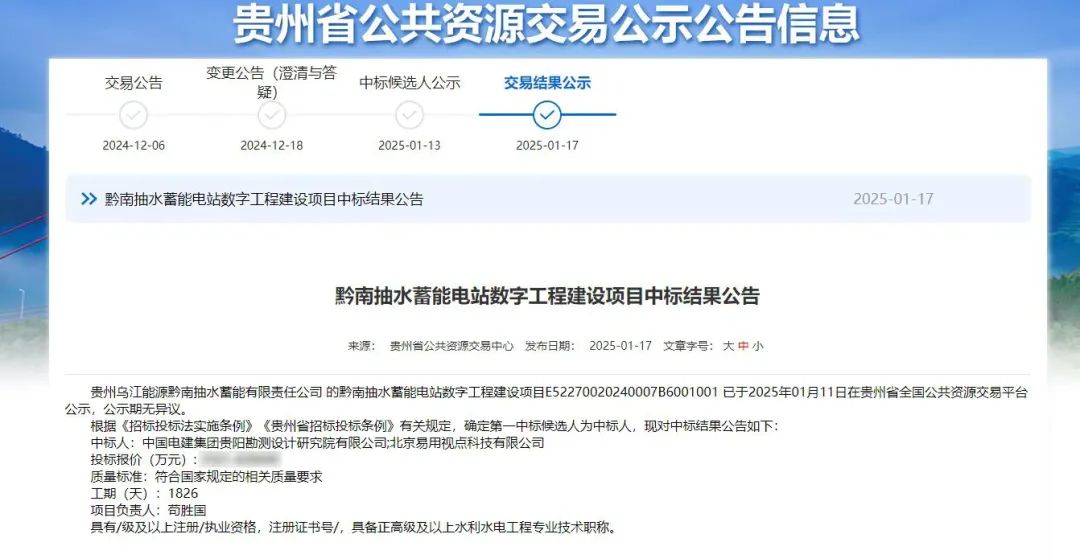 新年伊始,广哈通信控股子公司易用视点联合中电建贵阳勘探设计研究院中标贵州乌江能源黔南抽水蓄能有限责任公司黔南抽水蓄能电站数字工程建设项目。本次中标充分体现了公司在抽水蓄能电站数字工程建设领域的领先地位和品牌优势。
