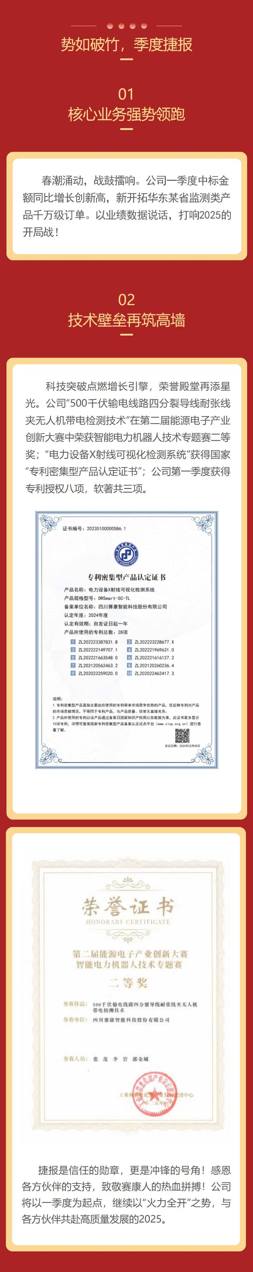 2025年第一季度,广哈通信控股子公司赛康智能以“技术+战略”双轮驱动,创造关键市场突破,中标金额同比增长创新高。在技术创新与行业荣誉上斩获累累硕果,实现经营业绩与品牌影响力双重跃升。