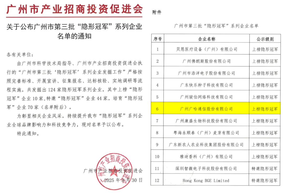 近日,广州市第三批“隐形冠军”企业名单揭晓,广哈通信凭借智能指挥调度领域的深厚积淀与突出实力成功入选。这一荣誉不仅是对其细分市场领导力的权威认可,更彰显了广州培育创新企业、激活产业动能的丰硕成果。