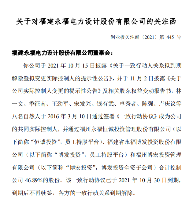 11月2日,永福股份(300712.SZ)收到深交所创业板关注函,被要求说明实际控制人变更后,林一文能否通过控制福州永福恒诚投资管理股份有限公司(下称“恒诚投资”)、福建省永福博发投资股份有限公司(下称“博发投资”)、福州博宏投资管理有限公司(下称“博宏投资”)3名股东实现对该公司的有效控制。