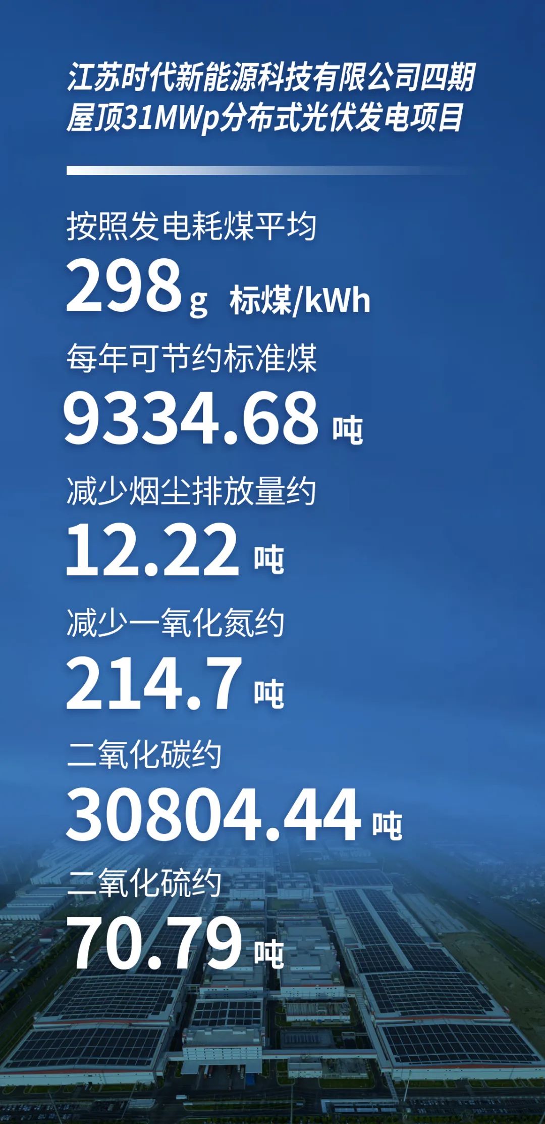该光伏项目于2022年4月开始动工,同年9月建成,布置于江苏时代新能源科技有限公司四期厂房屋顶及车棚区域,总装机规模达到31.137MW,项目总占地面积约286786.97平方米,年均年发电量为3000万度。项目采用“自发自用,余电上网”开发方式,实现了太阳能、建筑空间的综合利用,现为江苏省溧阳市单体装机容量最大的分布式光伏发电站之一。