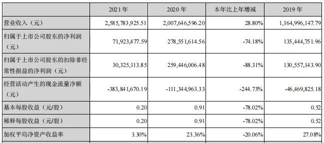 4月21日,江苏凯伦建材股份有限公司(股票简称:凯伦股份;股票代码:300715.SZ)披露了2021年年度报告。报告显示,该公司实现营业收入25.86亿元,同比增长28.8%;毛利率30.34%,同比下降12.86个百分点;净利润7131.36万元,同比减少74.4%;归属于上市公司股东的净利润7192.35万元,同比减少74.18%。