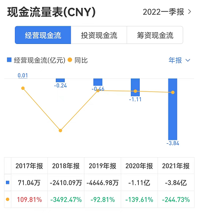 2018年-2021年,凯伦股份经营现金流分别为-2410.09万元、-4646.98万元、-1.11亿元、-3.84亿元,经营现金流持续为负。